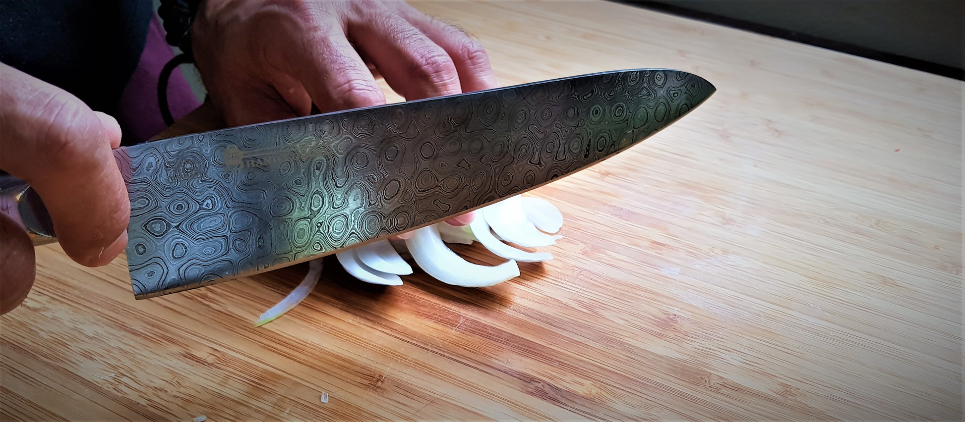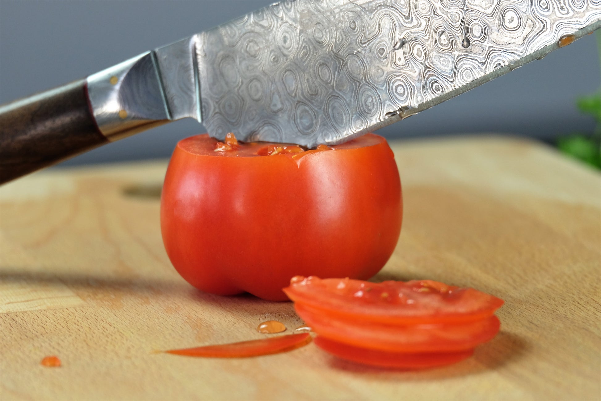 Die Klinge des Messers wird handgeschärft mit einem Doppelklingen-Bevel bei 16°, was einen Gesamtwinkel von 32° ergibt. Diese präzise Formgebung gewährleistet eine extrem scharfe und effiziente Schneide. Mit einer Härte von ca. 57-60 HRC bietet das Messer eine beeindruckende Schnitthaltigkeit und ist robust genug für den täglichen Gebrauch in der Küche.