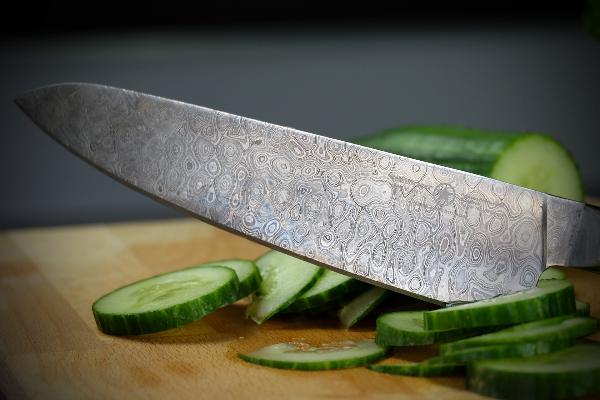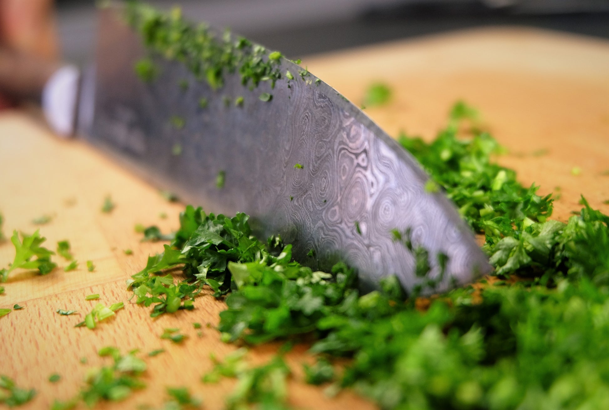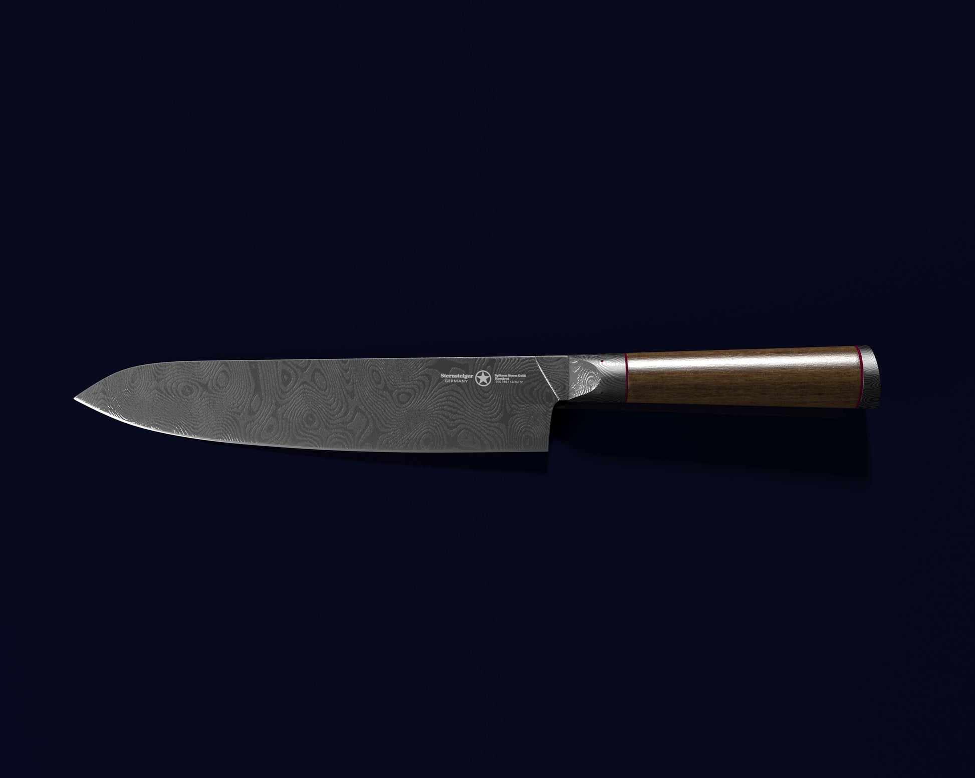 Das Herzstück dieses Kochmessers bildet der Griff aus reinem Walnussholz, der durch Kappe und Endstück aus echtem Damaststahl ergänzt wird. Diese Elemente bieten nicht nur eine verbesserte Optik gegenüber herkömmlichen Edelstahlkappen, sondern auch erhöhte Langlebigkeit. Die geschwungene Kante der Klinge ist ideal für Wiegeschnitte und ermöglicht präzises Arbeiten bei der Zubereitung Ihrer Speisen.